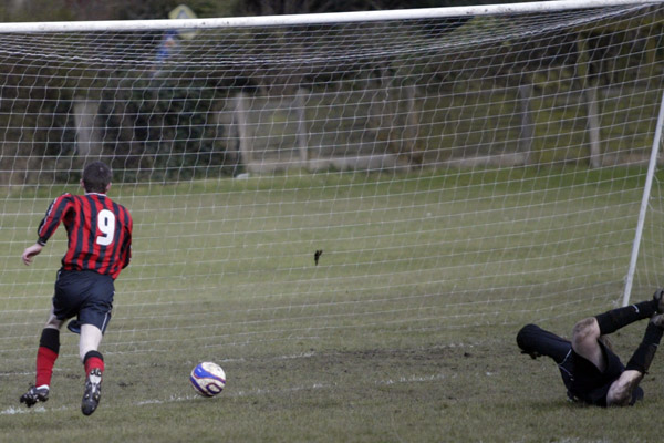 Midfield man Joe Kosub thought he’d notched his first goal for the team on 72 minutes but the referee deemed his aerial barge over the line of the ball-holding ‘keeper unfair and the ‘goal’ was struck-off.