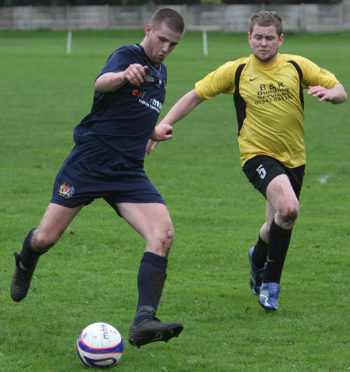 Lee Bushell’s quickfire double knocked the stuffing out of visitors Aspull in Saturday’s Lancashire Amateur Cup second round tie at Heys Road. Further strikes from Danny Smith and Mike Kirkley gave the visitors a 4-0 lead at the break which despite two consolation goals from the visitors, was enough to send the Blues through.