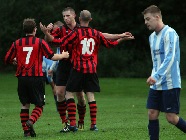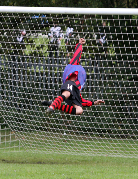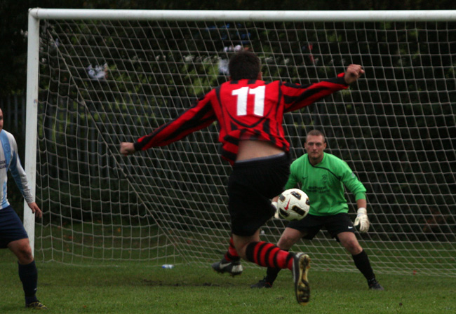 And just as Prestwich’s missed penalty at weekend was immediately punished by Chaddertonians, Craig Howarth’s team surged up the other end of the pitch with Luke Smith supplying Roberts who fired low across the ‘keeper and in to the far corner for two-nil.