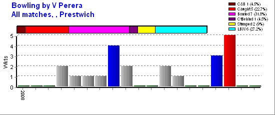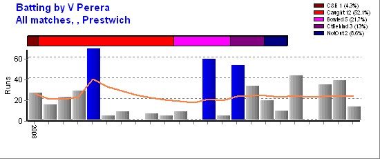 | 2008 | 29 | 23 | 2 | 495 | 69* | 23.57 | - | 3 | 135.2 | 13 | 515 | 22 | 23.41 | 5-48 | - | 1 | 16 | - | 2 |