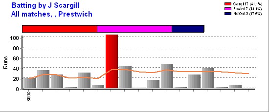 | 2008 | 23 | 17 | 3 | 412 | 105* | 29.43 | 1 | - | 4 | - | 15 | - | - | 0-15 | - | - | 5 | - | - |