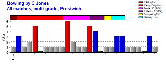 | Division One | 26 | 9 | 2 | 49 | 26* | 7.00 | - | - | 221.5 | 44 | 710 | 43 | 16.51 | 6-29 | - | 3 | 5 | - | 1 |